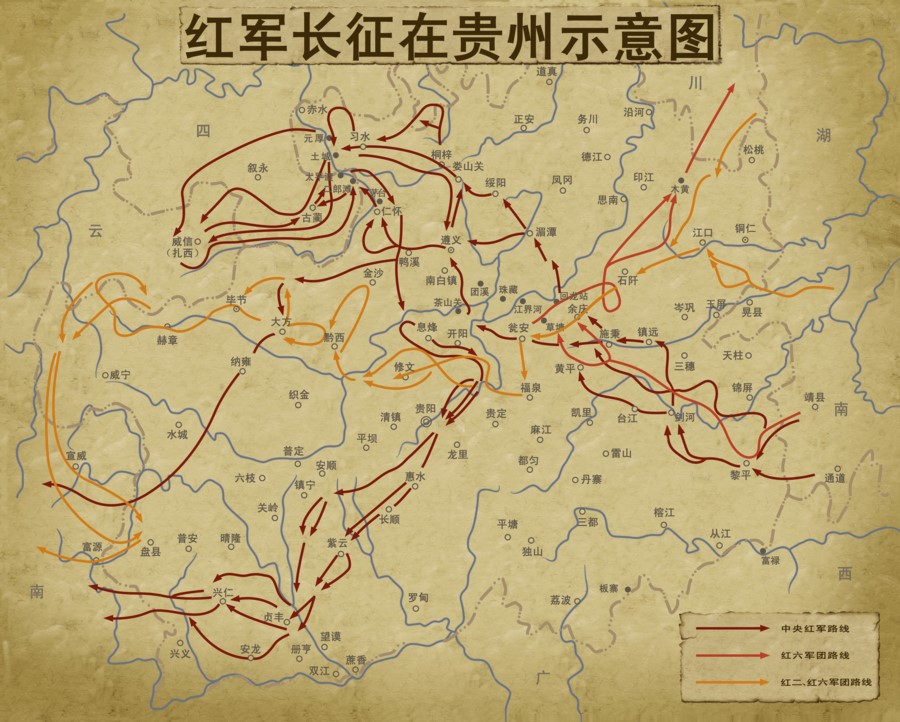 1月19日离开遵义北上进入习水县,计划从川南泸州、宜宾之间北渡长江,但却遭到川军的疯狂阻拦,毛主席果断放弃习水北上入川计划,撤出战斗,西渡赤水,准备从川南古蔺、叙永北渡长江入川,因势利导进而围绕赤水河:西渡—东渡—西渡—东渡,即四渡赤水。四渡赤水折返遵义后南渡乌江,进逼贵阳,神速地从贵州腹地贵阳和龙里县之间南下西进,甩掉敌人,经安顺、黔西南州各县到达云南边境,1935年4月23日由兴义进入云南富源县。