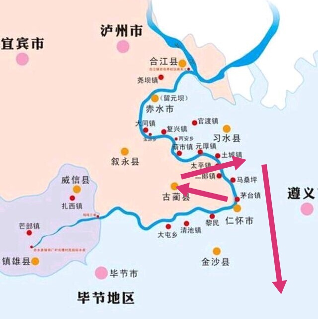 第四次渡赤水河:泸州古蔺县→二郎滩/太平渡→遵义仁怀→毕节金沙县→贵阳息烽县