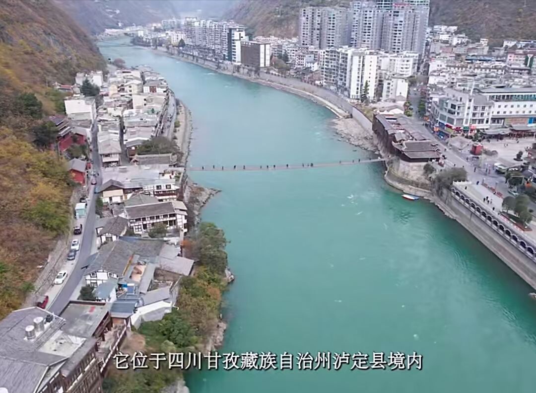 泸定桥全景图,全国重点文物保护单位,大渡河从北流向南,泸定县城主城区在右侧即东侧