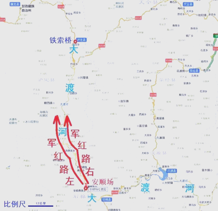 红军在雅安市石棉县安顺场渡口东渡大渡河兵分两路飞夺泸定桥,泸定县城在大渡河的东岸