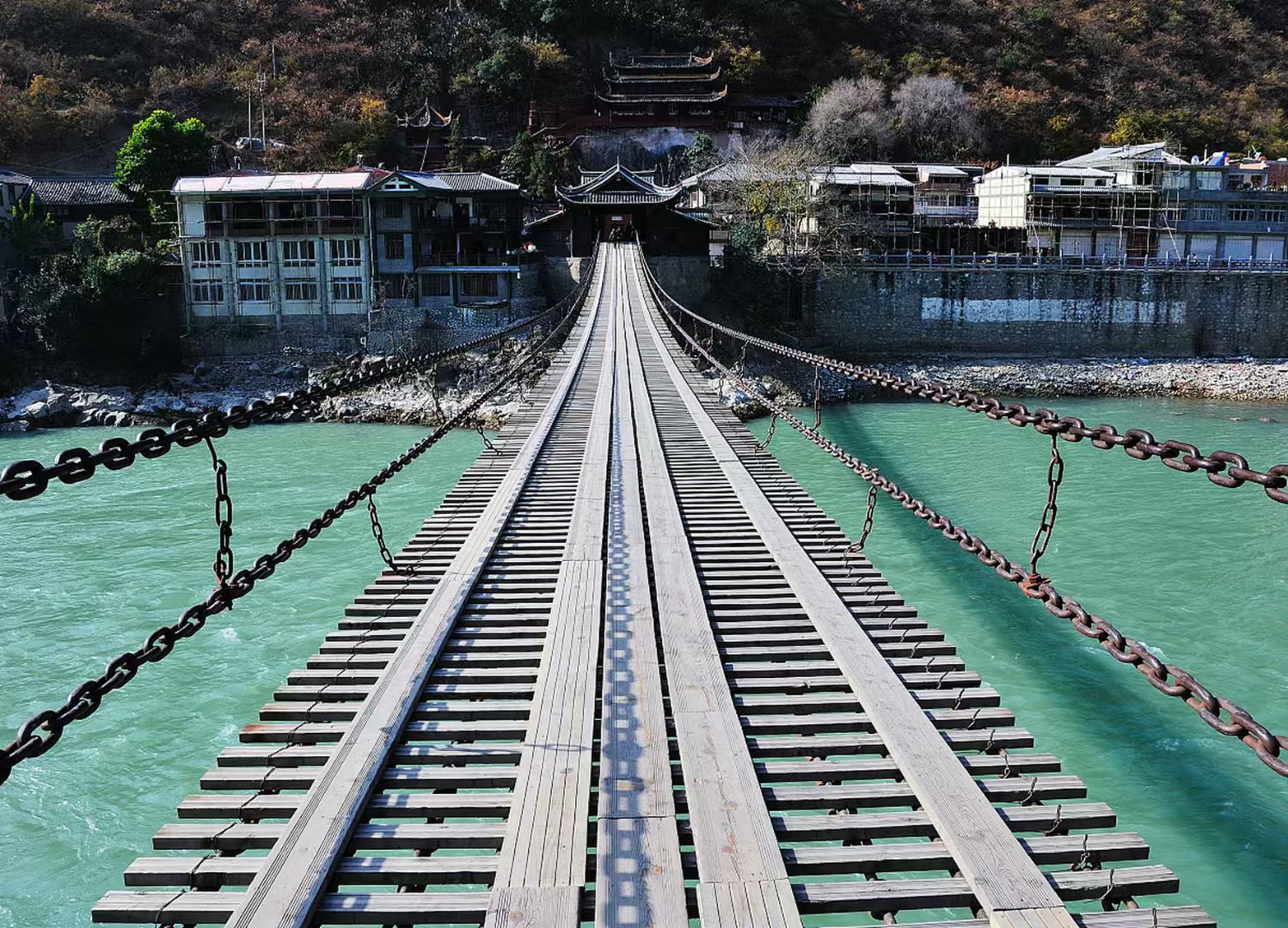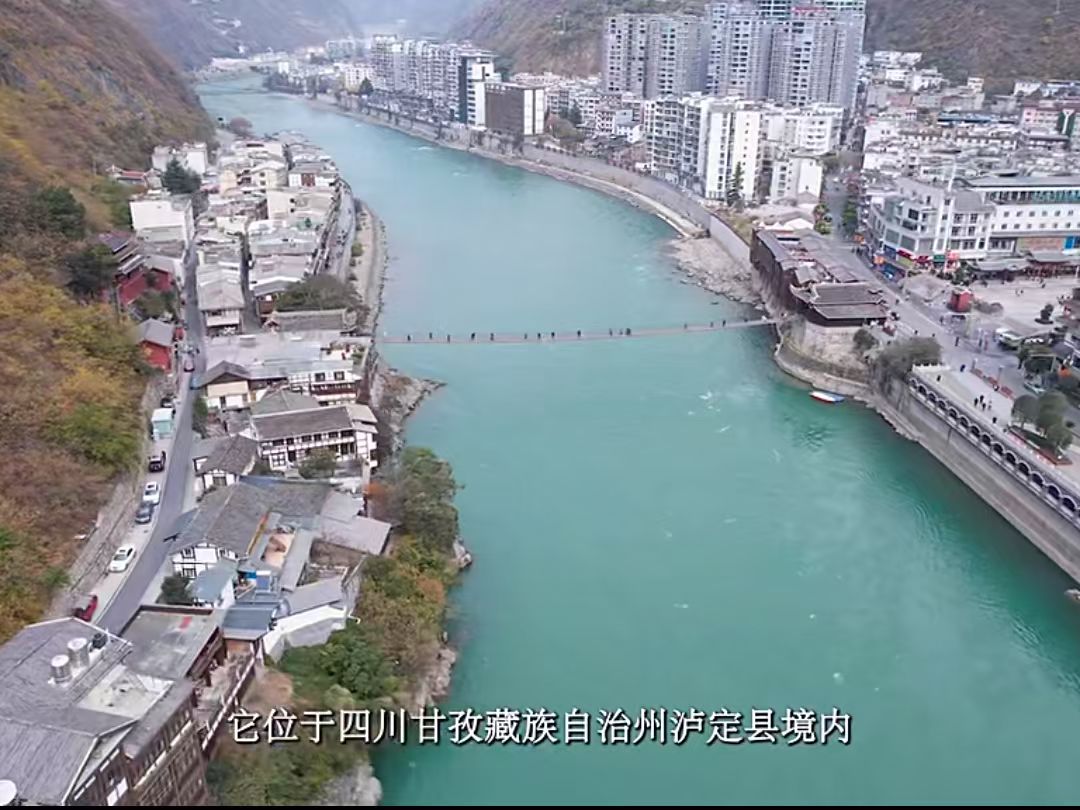 泸定桥全景图,全国重点文物保护单位,大渡河从北流向南,泸定县城主城区在右侧即东侧