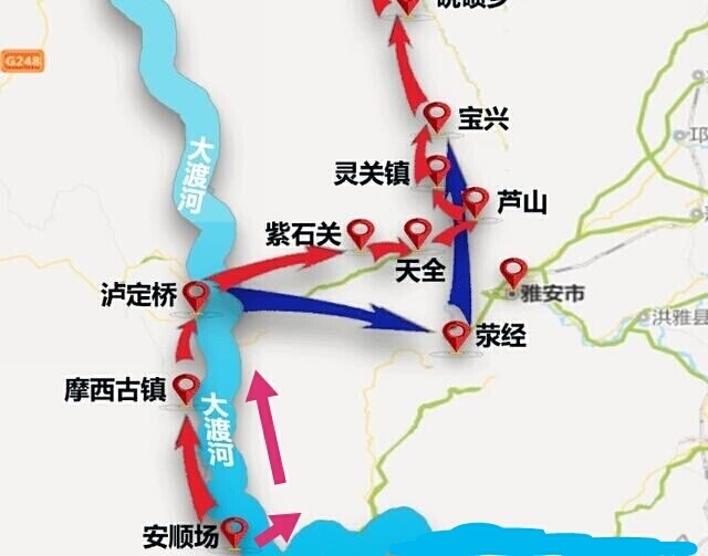 红军在雅安市石棉县安顺场渡口强渡大渡河兵分两路飞夺泸定桥,泸定县城在大渡河的东岸